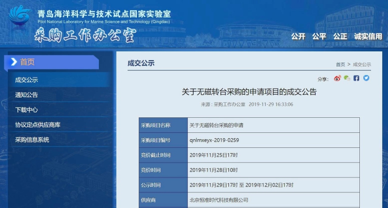 我公司無磁轉(zhuǎn)臺產(chǎn)品成功中標(biāo)青島海洋科學(xué)與技術(shù)試點國家實驗室采購項目